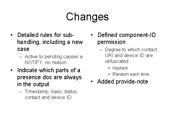 Changes Detailed rules for sub-handling, including a new case Active to pending causes a NOTIFY, no reason Indicate which parts of a presence doc are always in the output Timestamp, basic status, contact and device ID Defined component-ID permission Degree to which contact URI and device ID are obfuscated Hashed Random each time Added provide-note |