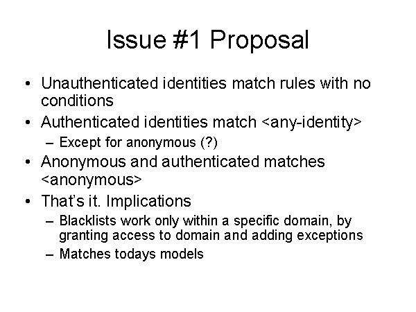 Issue #1 Proposal Unauthenticated identities match rules with no conditions Authenticated identities match Except for anonymous (?) Anonymous and authenticated matches That’s it. Implications Blacklists work only within a specific domain, by granting access to domain and adding exceptions Matches todays models |