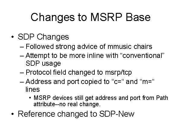Changes to MSRP Base SDP Changes Followed strong advice of mmusic chairs Attempt to be more inline with “conventional” SDP usage Protocol field changed to msrp/tcp Address and port copied to “c=“ and “m=“ lines MSRP devices still get address and port from Path attribute--no real change. Reference changed to SDP-New |