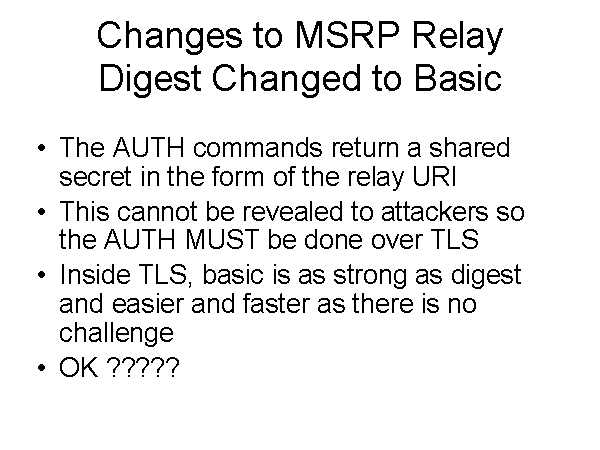 Changes to MSRP RelayDigest Changed to Basic The AUTH commands return a shared secret in the form of the relay URI This cannot be revealed to attackers so the AUTH MUST be done over TLS Inside TLS, basic is as strong as digest and easier and faster as there is no challenge OK ????? |