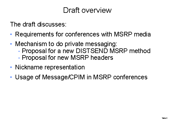 Draft overview The draft discusses: Requirements for conferences with MSRP media Mechanism to do private messaging: Proposal for a new DISTSEND MSRP method Proposal for new MSRP headers Nickname representation Usage of Message/CPIM in MSRP conferences |