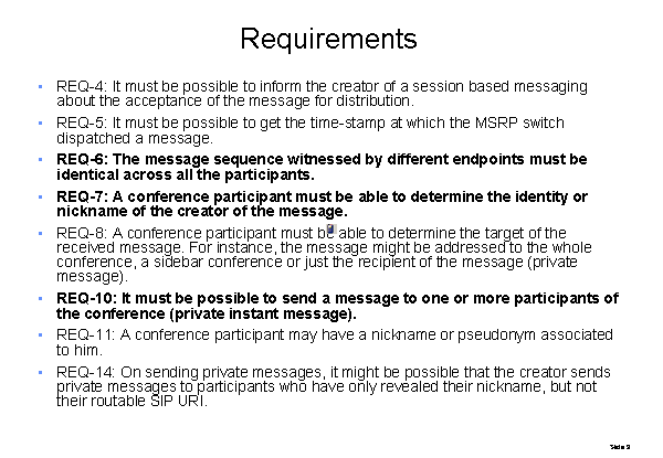 Requirements REQ-4: It must be possible to inform the creator of a session based messaging about the acceptance of the message for distribution. REQ-5: It must be possible to get the time-stamp at which the MSRP switch dispatched a message. REQ-6: The message sequence witnessed by different endpoints must be identical across all the participants. REQ-7: A conference participant must be able to determine the identity or nickname of the creator of the message. REQ-8: A conference participant must be able to determine the target of the received message. For instance, the message might be addressed to the whole conference, a sidebar conference or just the recipient of the message (private message). REQ-10: It must be possible to send a message to one or more participants of the conference (private instant message). REQ-11: A conference participant may have a nickname or pseudonym associated to him. REQ-14: On sending private messages, it might be possible that the creator sends private messages to participants who have only revealed their nickname, but not their routable SIP URI. |