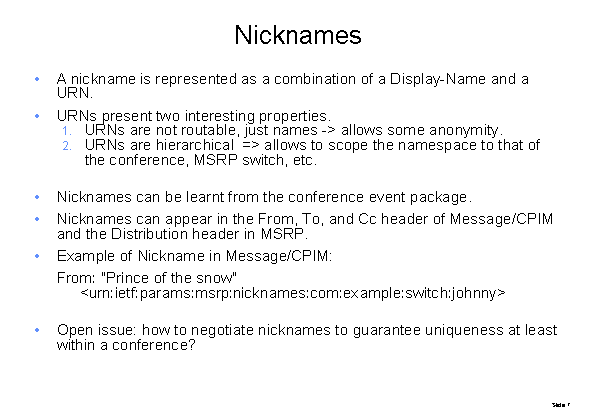 Nicknames A nickname is represented as a combination of a Display-Name and a URN. URNs present two interesting properties. URNs are not routable, just names -> allows some anonymity. URNs are hierarchical => allows to scope the namespace to that of the conference, MSRP switch, etc. Nicknames can be learnt from the conference event package. Nicknames can appear in the From, To, and Cc header of Message/CPIM and the Distribution header in MSRP. Example of Nickname in Message/CPIM: From: "Prince of the snow" Open issue: how to negotiate nicknames to guarantee uniqueness at least within a conference? |