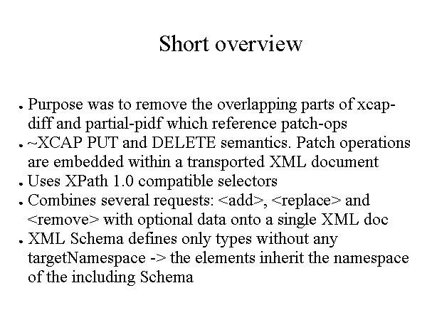 Short overview Purpose was to remove the overlapping parts of xcap-diff and partial-pidf which reference patch-ops ~XCAP PUT and DELETE semantics. Patch operations are embedded within a transported XML document Uses XPath 1.0 compatible selectors Combines several requests: XML Schema defines only types without any targetNamespace -> the elements inherit the namespace of the including Schema |