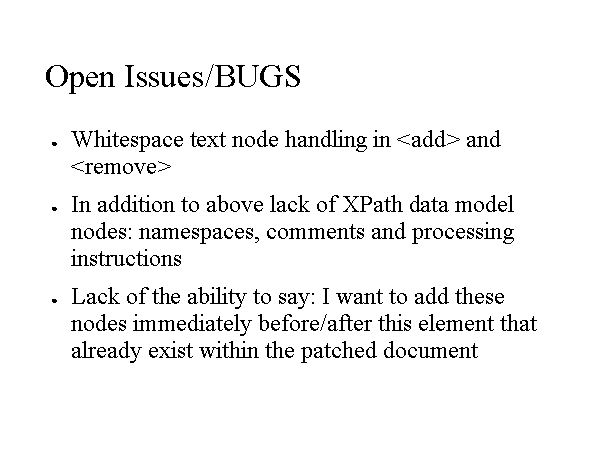 Open Issues/BUGS Whitespace text node handling in In addition to above lack of XPath data model nodes: namespaces, comments and processing instructions Lack of the ability to say: I want to add these nodes immediately before/after this element that already exist within the patched document |