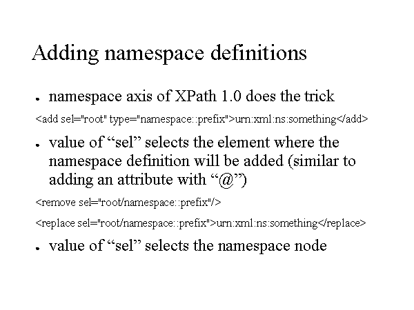 value of “sel” selects the element where the namespace definition will be added (similar to adding an attribute with “@”) urn:xml:ns:something