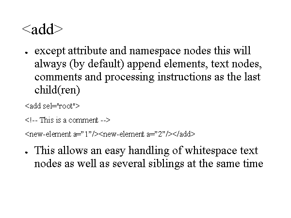 except attribute and namespace nodes this will always (by default) append elements, text nodes, comments and processing instructions as the last child(ren) This allows an easy handling of whitespace text nodes as well as several siblings at the same time |