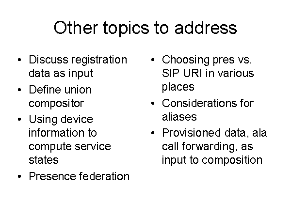 Other topics to address Discuss registration data as input Define union compositor Using device information to compute service states Presence federation Choosing pres vs. SIP URI in various places Considerations for aliases Provisioned data, ala call forwarding, as input to composition |