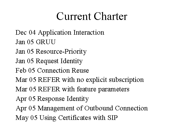 Current Charter Dec 04 Application Interaction Jan 05 GRUU Jan 05 Resource-Priority Jan 05 Request Identity Feb 05 Connection Reuse Mar 05 REFER with no explicit subscription Mar 05 REFER with feature parameters Apr 05 Response Identity Apr 05 Management of Outbound Connection May 05 Using Certificates with SIP |
