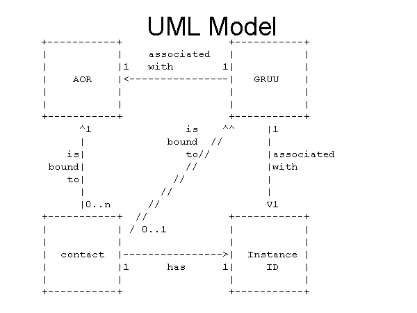 UML Model +-----------+ +-----------+ | | associated | | | |1 with 1| | | AOR |<----------------| GRUU | | | | | | | | | +-----------+ +-----------+ ^1 is ^^ |1 | bound // | is| to// |associated bound| // |with to| // | | // | |0..n // V1 +-----------+ // +-----------+ | | / 0..1 | | | | | | | contact |---------------->| Instance | | |1 has 1| ID | | | | | +-----------+ +-----------+ |