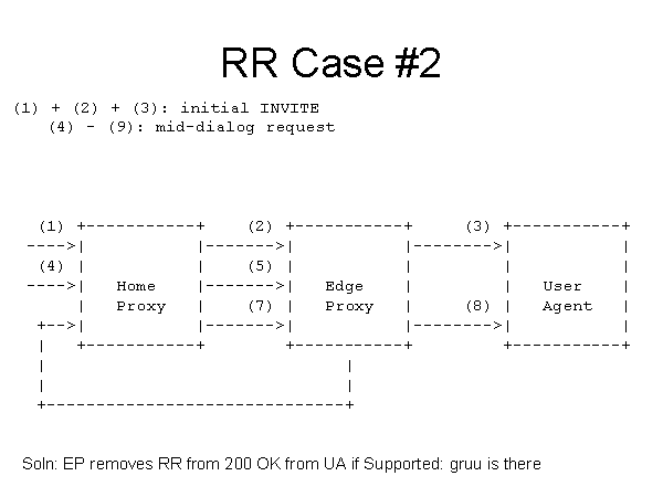 RR Case #2 (1) + (2) + (3): initial INVITE (4) - (9): mid-dialog request (1) +-----------+ (2) +-----------+ (3) +-----------+ ---->| |------->| |-------->| | (4) | | (5) | | | | ---->| Home |------->| Edge | | User | | Proxy | (7) | Proxy | (8) | Agent | +-->| |------->| |-------->| | | +-----------+ +-----------+ +-----------+ | | | | +------------------------------+ Soln: EP removes RR from 200 OK from UA if Supported: gruu is there |