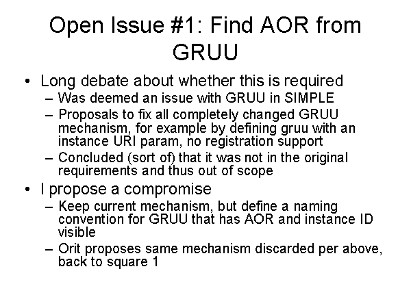 Open Issue #1: Find AOR from GRUU Long debate about whether this is required Was deemed an issue with GRUU in SIMPLE Proposals to fix all completely changed GRUU mechanism, for example by defining gruu with an instance URI param, no registration support Concluded (sort of) that it was not in the original requirements and thus out of scope I propose a compromise Keep current mechanism, but define a naming convention for GRUU that has AOR and instance ID visible Orit proposes same mechanism discarded per above, back to square 1 |