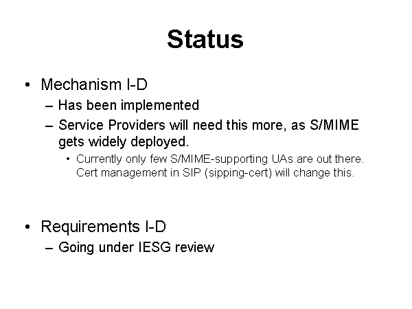 Status Mechanism I-D Has been implemented Service Providers will need this more, as S/MIME gets widely deployed. Currently only few S/MIME-supporting UAs are out there. Cert management in SIP (sipping-cert) will change this. Requirements I-D Going under IESG review |