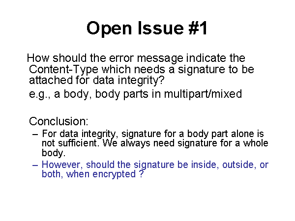 Open Issue #1 How should the error message indicate the Content-Type which needs a signature to be attached for data integrity? e.g., a body, body parts in multipart/mixed Conclusion: For data integrity, signature for a body part alone is not sufficient. We always need signature for a whole body. However, should the signature be inside, outside, or both, when encrypted ? |