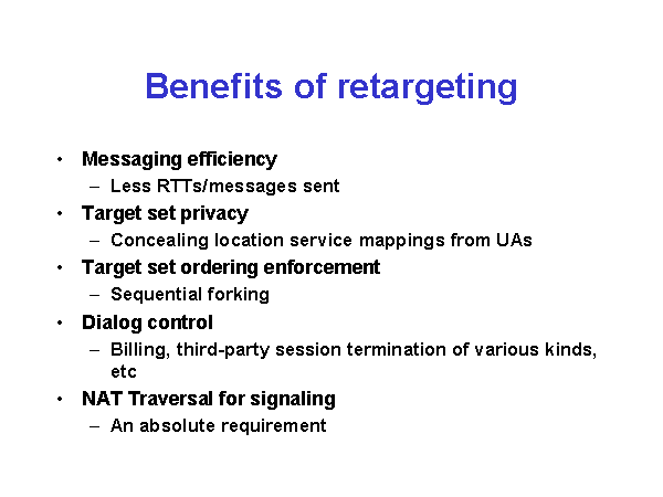 Benefits of retargeting Messaging efficiency Less RTTs/messages sent Target set privacy Concealing location service mappings from UAs Target set ordering enforcement Sequential forking Dialog control Billing, third-party session termination of various kinds, etc NAT Traversal for signaling An absolute requirement |