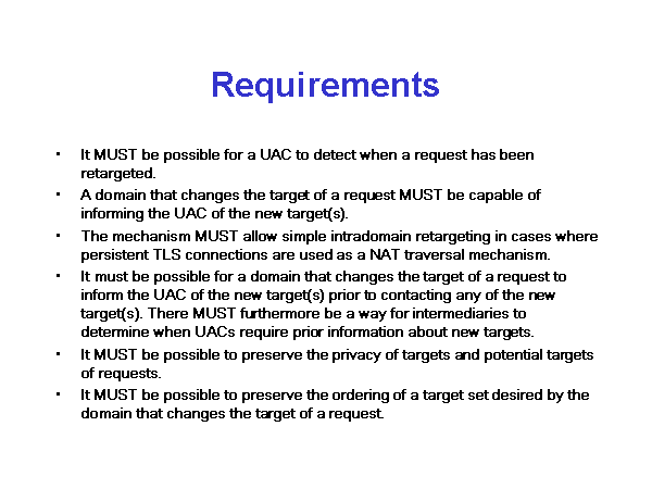 Requirements It MUST be possible for a UAC to detect when a request has been retargeted. A domain that changes the target of a request MUST be capable of informing the UAC of the new target(s). The mechanism MUST allow simple intradomain retargeting in cases where persistent TLS connections are used as a NAT traversal mechanism. It must be possible for a domain that changes the target of a request to inform the UAC of the new target(s) prior to contacting any of the new target(s). There MUST furthermore be a way for intermediaries to determine when UACs require prior information about new targets. It MUST be possible to preserve the privacy of targets and potential targets of requests. It MUST be possible to preserve the ordering of a target set desired by the domain that changes the target of a request. |