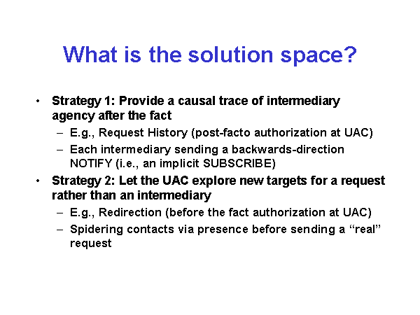 What is the solution space? Strategy 1: Provide a causal trace of intermediary agency after the fact E.g., Request History (post-facto authorization at UAC) Each intermediary sending a backwards-direction NOTIFY (i.e., an implicit SUBSCRIBE) Strategy 2: Let the UAC explore new targets for a request rather than an intermediary E.g., Redirection (before the fact authorization at UAC) Spidering contacts via presence before sending a “real” request |