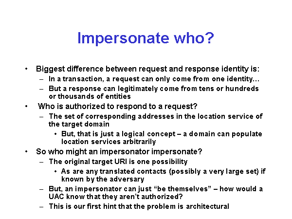 Impersonate who? Biggest difference between request and response identity is: In a transaction, a request can only come from one identity… But a response can legitimately come from tens or hundreds or thousands of entities Who is authorized to respond to a request? The set of corresponding addresses in the location service of the target domain But, that is just a logical concept – a domain can populate location services arbitrarily So who might an impersonator impersonate? The original target URI is one possibility As are any translated contacts (possibly a very large set) if known by the adversary But, an impersonator can just “be themselves” – how would a UAC know that they aren’t authorized? This is our first hint that the problem is architectural |