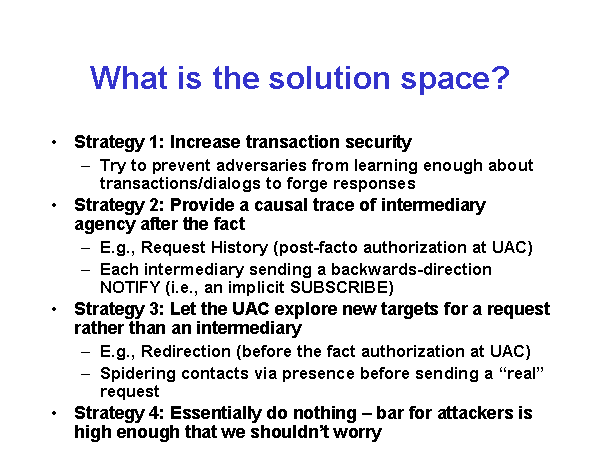 What is the solution space? Strategy 1: Increase transaction security Try to prevent adversaries from learning enough about transactions/dialogs to forge responses Strategy 2: Provide a causal trace of intermediary agency after the fact E.g., Request History (post-facto authorization at UAC) Each intermediary sending a backwards-direction NOTIFY (i.e., an implicit SUBSCRIBE) Strategy 3: Let the UAC explore new targets for a request rather than an intermediary E.g., Redirection (before the fact authorization at UAC) Spidering contacts via presence before sending a “real” request Strategy 4: Essentially do nothing – bar for attackers is high enough that we shouldn’t worry |