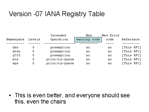 Version -07 IANA Registry Table Intended New New Error Namespace Levels Operation warning code code Reference --------- ------ ---------------- --------- ---- --------- dsn 5 preemption no no [This RFC] drsn 6 preemption no no [This RFC] q735 5 preemption no no [This RFC] ets 5 priority-queue no no [This RFC] wps 5 priority-queue no no [This RFC] This is even better, and everyone should see this, even the chairs |
