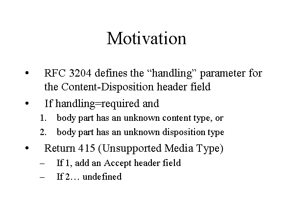 Motivation RFC 3204 defines the “handling” parameter for the Content-Disposition header field If handling=required and body part has an unknown content type, or body part has an unknown disposition type Return 415 (Unsupported Media Type) If 1, add an Accept header field If 2… undefined |