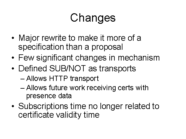 Changes Major rewrite to make it more of a specification than a proposal Few significant changes in mechanism Defined SUB/NOT as transports Allows HTTP transport Allows future work receiving certs with presence data Subscriptions time no longer related to certificate validity time |