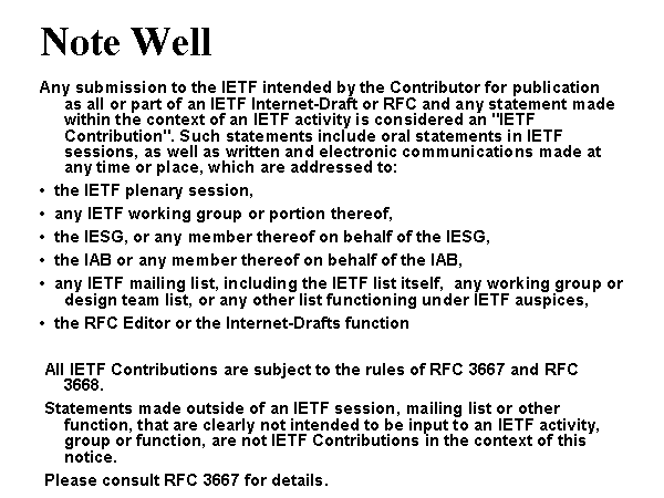 Note Well Any submission to the IETF intended by the Contributor for publication as all or part of an IETF Internet-Draft or RFC and any statement made within the context of an IETF activity is considered an "IETF Contribution". Such statements include oral statements in IETF sessions, as well as written and electronic communications made at any time or place, which are addressed to: • the IETF plenary session, • any IETF working group or portion thereof, • the IESG, or any member thereof on behalf of the IESG, • the IAB or any member thereof on behalf of the IAB, • any IETF mailing list, including the IETF list itself, any working group or design team list, or any other list functioning under IETF auspices, • the RFC Editor or the Internet-Drafts function All IETF Contributions are subject to the rules of RFC 3667 and RFC 3668. Statements made outside of an IETF session, mailing list or other function, that are clearly not intended to be input to an IETF activity, group or function, are not IETF Contributions in the context of this notice. Please consult RFC 3667 for details. |