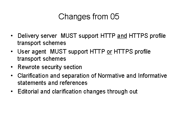 Changes from 05 Delivery server MUST support HTTP and HTTPS profile transport schemes User agent MUST support HTTP or HTTPS profile transport schemes Rewrote security section Clarification and separation of Normative and Informative statements and references Editorial and clarification changes through out |
