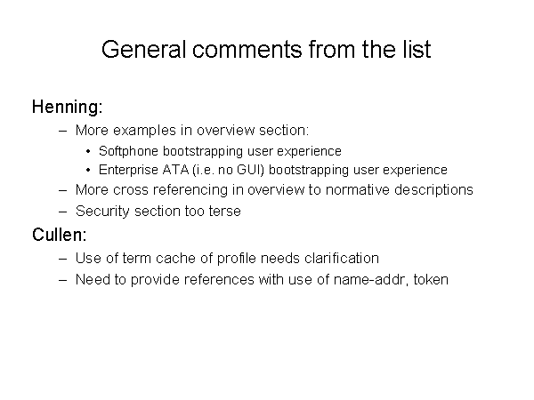 General comments from the list Henning: More examples in overview section: Softphone bootstrapping user experience Enterprise ATA (i.e. no GUI) bootstrapping user experience More cross referencing in overview to normative descriptions Security section too terse Cullen: Use of term cache of profile needs clarification Need to provide references with use of name-addr, token |