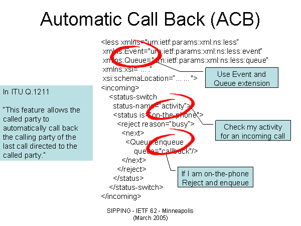 Automatic Call Back (ACB) xmlns:xsi=“….“ xsi:schemaLocation=“……"> In ITU Q.1211 “This feature allows the called party to automatically call back the calling party of the last call directed to the called party.” Check my activity for an incoming call Use Event and Queue extension If I am on-the-phone Reject and enqueue |