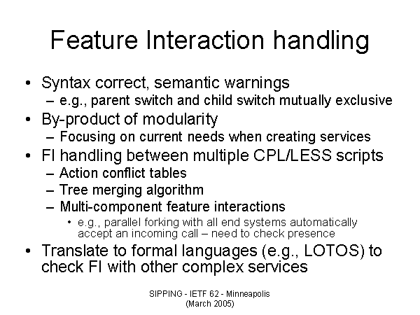 Feature Interaction handling Syntax correct, semantic warnings e.g., parent switch and child switch mutually exclusive By-product of modularity Focusing on current needs when creating services FI handling between multiple CPL/LESS scripts Action conflict tables Tree merging algorithm Multi-component feature interactions e.g., parallel forking with all end systems automatically accept an incoming call – need to check presence Translate to formal languages (e.g., LOTOS) to check FI with other complex services |