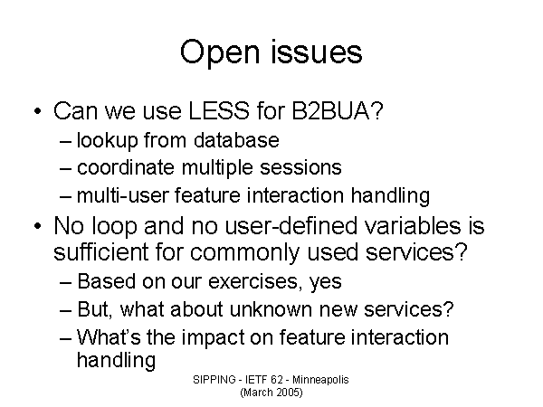 Open issues Can we use LESS for B2BUA? lookup from database coordinate multiple sessions multi-user feature interaction handling No loop and no user-defined variables is sufficient for commonly used services? Based on our exercises, yes But, what about unknown new services? What’s the impact on feature interaction handling |