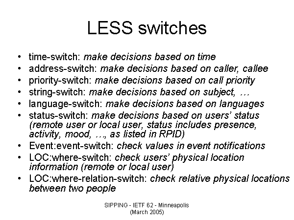 LESS switches time-switch: make decisions based on time address-switch: make decisions based on caller, callee priority-switch: make decisions based on call priority string-switch: make decisions based on subject, … language-switch: make decisions based on languages status-switch: make decisions based on users’ status (remote user or local user, status includes presence, activity, mood, …, as listed in RPID) Event:event-switch: check values in event notifications LOC:where-switch: check users’ physical location information (remote or local user) LOC:where-relation-switch: check relative physical locations between two people |