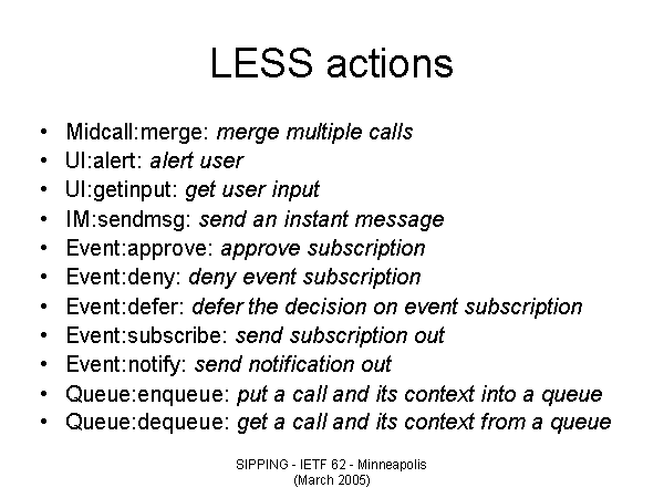 LESS actions Midcall:merge: merge multiple calls UI:alert: alert user UI:getinput: get user input IM:sendmsg: send an instant message Event:approve: approve subscription Event:deny: deny event subscription Event:defer: defer the decision on event subscription Event:subscribe: send subscription out Event:notify: send notification out Queue:enqueue: put a call and its context into a queue Queue:dequeue: get a call and its context from a queue |