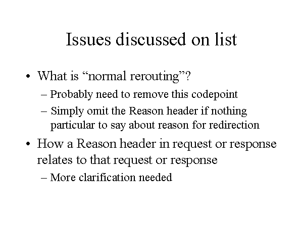 Issues discussed on list What is “normal rerouting”? Probably need to remove this codepoint Simply omit the Reason header if nothing particular to say about reason for redirection How a Reason header in request or response relates to that request or response More clarification needed |