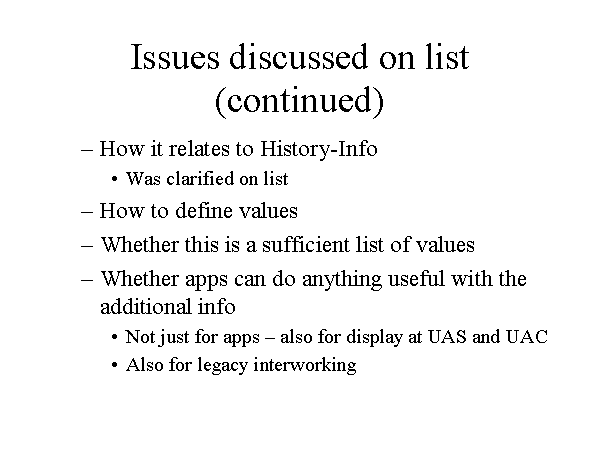Issues discussed on list (continued) How it relates to History-Info Was clarified on list How to define values Whether this is a sufficient list of values Whether apps can do anything useful with the additional info Not just for apps – also for display at UAS and UAC Also for legacy interworking |
