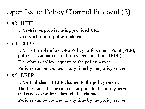 #3: HTTP UA retrieves policies using provided URI. No asynchronous policy updates. #4: COPS UA has the role of a COPS Policy Enforcement Point (PEP), policy server has role of Policy Decision Point (PDP). UA submits policy requests to the policy server. Policies can be updated at any time by the policy server. #5: BEEP UA establishes a BEEP channel to the policy server. The UA sends the session description to the policy server and receives policies through this channel. Policies can be updated at any time by the policy server. Open Issue: Policy Channel Protocol (2) |
