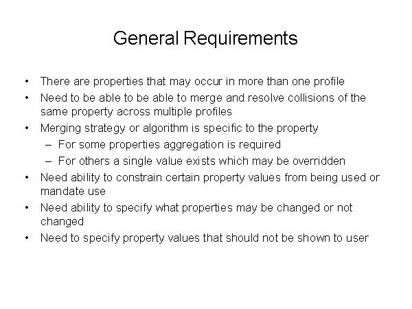 General Requirements There are properties that may occur in more than one profile Need to be able to be able to merge and resolve collisions of the same property across multiple profiles Merging strategy or algorithm is specific to the property For some properties aggregation is required For others a single value exists which may be overridden Need ability to constrain certain property values from being used or mandate use Need ability to specify what properties may be changed or not changed Need to specify property values that should not be shown to user |