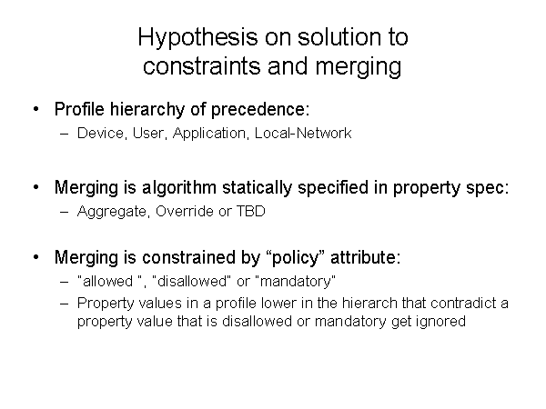 Hypothesis on solution to constraints and merging Profile hierarchy of precedence: Device, User, Application, Local-Network Merging is algorithm statically specified in property spec: Aggregate, Override or TBD Merging is constrained by “policy” attribute: “allowed “, “disallowed” or “mandatory” Property values in a profile lower in the hierarch that contradict a property value that is disallowed or mandatory get ignored |