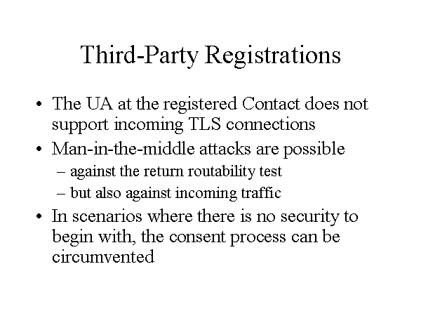 Third-Party Registrations The UA at the registered Contact does not support incoming TLS connections Man-in-the-middle attacks are possible against the return routability test but also against incoming traffic In scenarios where there is no security to begin with, the consent process can be circumvented |