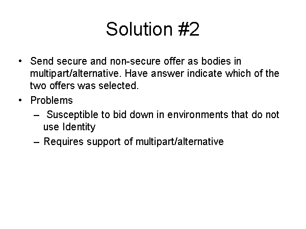Solution #2 Send secure and non-secure offer as bodies in multipart/alternative. Have answer indicate which of the two offers was selected. Problems Susceptible to bid down in environments that do not use Identity Requires support of multipart/alternative |