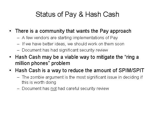 Status of Pay & Hash Cash There is a community that wants the Pay approach A few vendors are starting implementations of Pay If we have better ideas, we should work on them soon Document has had significant security review Hash Cash may be a viable way to mitigate the “ring a million phones” problem Hash Cash is a way to reduce the amount of SPIM/SPIT The zombie argument is the most significant issue in deciding if this is worth doing Document has not had careful security review |