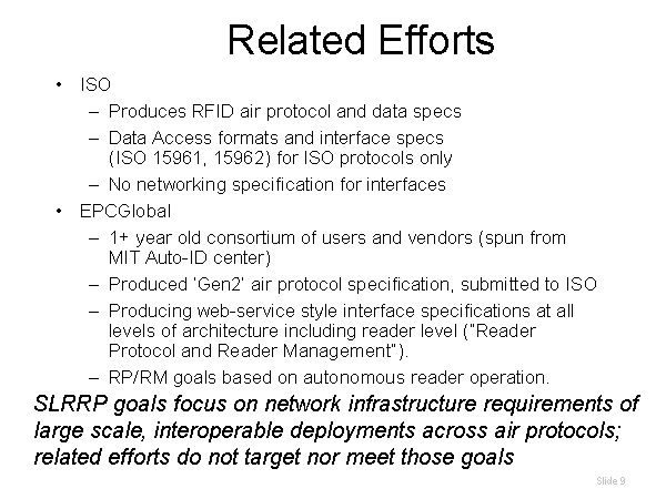 Related Efforts ISO Produces RFID air protocol and data specs Data Access formats and interface specs (ISO 15961, 15962) for ISO protocols only No networking specification for interfaces EPCGlobal 1+ year old consortium of users and vendors (spun from MIT Auto-ID center) Produced ‘Gen2’ air protocol specification, submitted to ISO Producing web-service style interface specifications at all levels of architecture including reader level (“Reader Protocol and Reader Management”). RP/RM goals based on autonomous reader operation. SLRRP goals focus on network infrastructure requirements of large scale, interoperable deployments across air protocols; related efforts do not target nor meet those goals |
