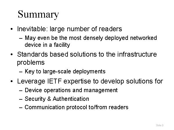 Summary Inevitable: large number of readers May even be the most densely deployed networked device in a facility Standards based solutions to the infrastructure problems Key to large-scale deployments Leverage IETF expertise to develop solutions for Device operations and management Security & Authentication Communication protocol to/from readers |
