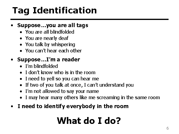 Tag Identification Suppose…you are all tags You are all blindfolded You are nearly deaf You talk by whispering You can’t hear each other Suppose…I’m a reader I’m blindfolded I don’t know who is in the room I need to yell so you can hear me If two of you talk at once, I can’t understand you I’m not allowed to say your name I may hear many others like me screaming in the same room I need to identify everybody in the room What do I do? |