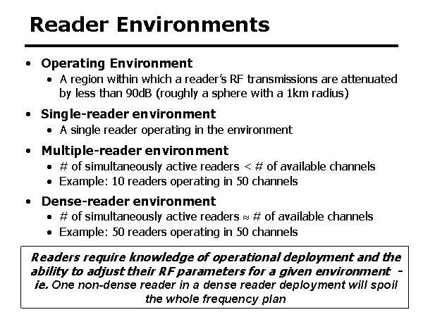 Reader Environments Operating Environment A region within which a reader’s RF transmissions are attenuated by less than 90dB (roughly a sphere with a 1km radius) Single-reader environment A single reader operating in the environment Multiple-reader environment # of simultaneously active readers < # of available channels Example: 10 readers operating in 50 channels Dense-reader environment # of simultaneously active readers ? # of available channels Example: 50 readers operating in 50 channels Readers require knowledge of operational deployment and the ability to adjust their RF parameters for a given environment -ie. One non-dense reader in a dense reader deployment will spoil the whole frequency plan |