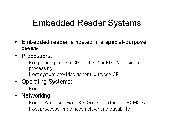 Embedded Reader Systems Embedded reader is hosted in a special-purpose device Processors: No general purpose CPU -- DSP or FPGA for signal processing Host system provides general purpose CPU Operating Systems: None. Networking: None. Accessed via USB, Serial interface or PCMCIA Host processor may have networking capability |