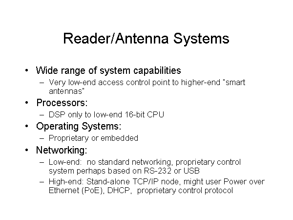 Reader/Antenna Systems Wide range of system capabilities Very low-end access control point to higher-end “smart antennas” Processors: DSP only to low-end 16-bit CPU Operating Systems: Proprietary or embedded Networking: Low-end: no standard networking, proprietary control system perhaps based on RS-232 or USB High-end: Stand-alone TCP/IP node, might user Power over Ethernet (PoE), DHCP, proprietary control protocol |