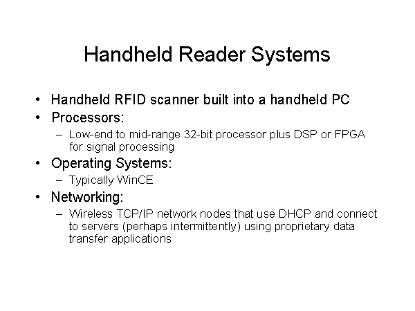 Handheld Reader Systems Handheld RFID scanner built into a handheld PC Processors: Low-end to mid-range 32-bit processor plus DSP or FPGA for signal processing Operating Systems: Typically WinCE Networking: Wireless TCP/IP network nodes that use DHCP and connect to servers (perhaps intermittently) using proprietary data transfer applications |