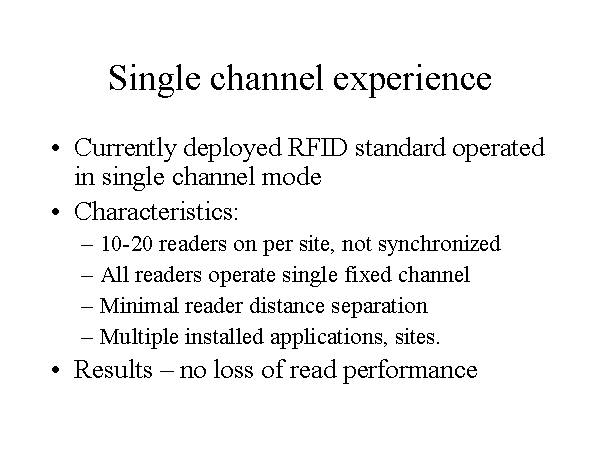 Single channel experience Currently deployed RFID standard operated in single channel mode Characteristics: 10-20 readers on per site, not synchronized All readers operate single fixed channel Minimal reader distance separation Multiple installed applications, sites. Results – no loss of read performance |